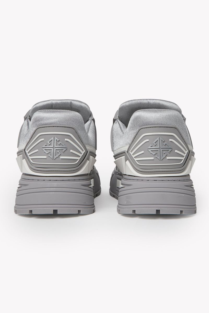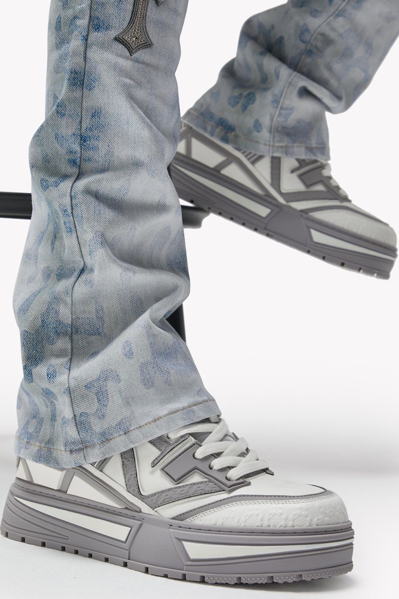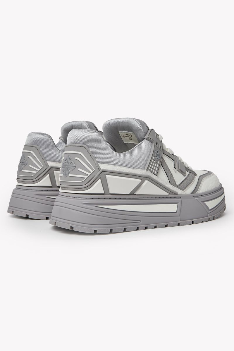 Crafted with a two-tone grey and off-white colorway, the sneaker features intricate panel overlays and GUAPI’s signature geometric embossments. The silhouette offers a bulky yet balanced frame, amplified by a sculpted outsole that delivers comfort and visual dominance. Glossy synthetic trims, embossed logos, and patterned texturing across the toe box add a refined edge to this urban warrior.