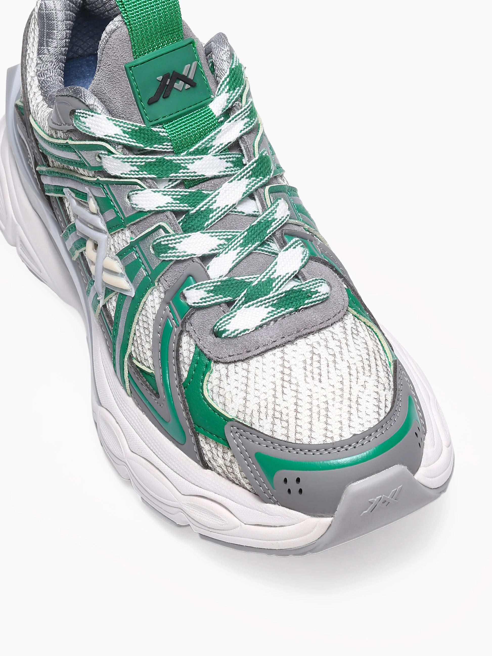 - Mixed-material upper with reflective overlays and suede toe